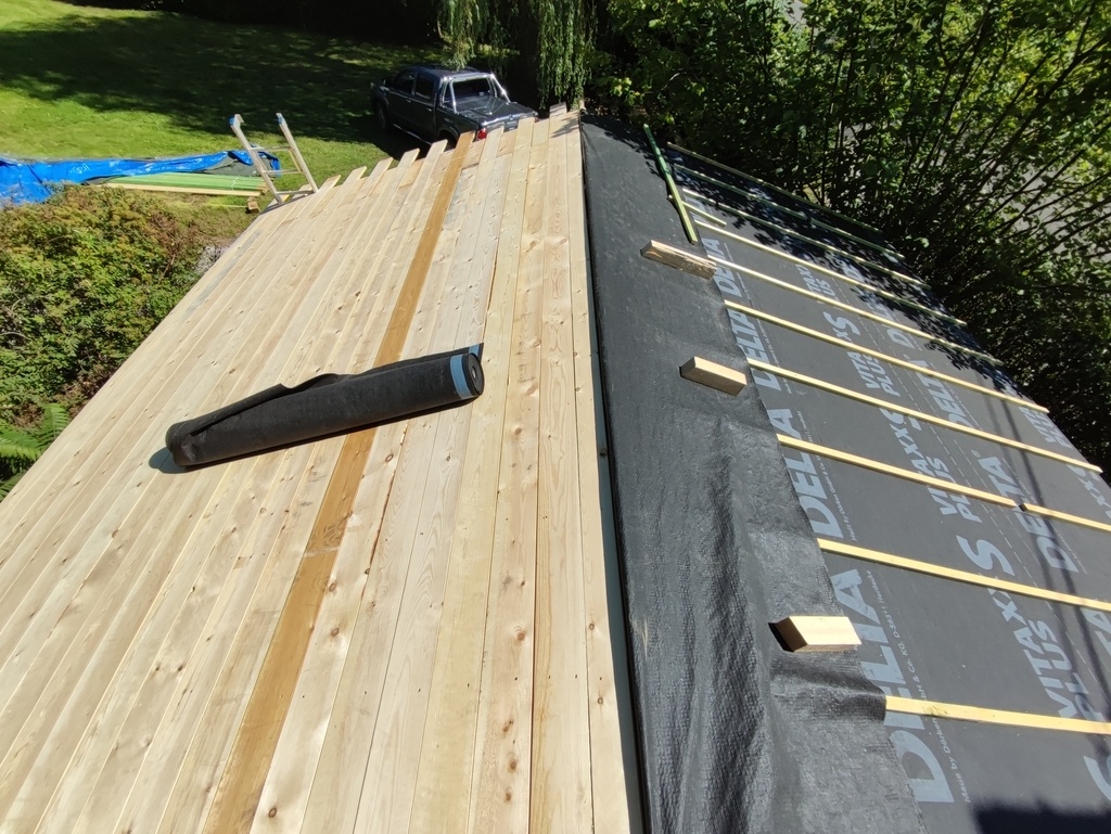 Pour la couverture nous avons mis des chevrons en 7x9 avec de la volige de 15 cm de large en 21mm rabotée. Les chevrons ont été sciés à l'aide de la gruminette. Nous avons par contre acheté la volige et les lattes à panne. Un pare pluie et un closoir ont également été installés.