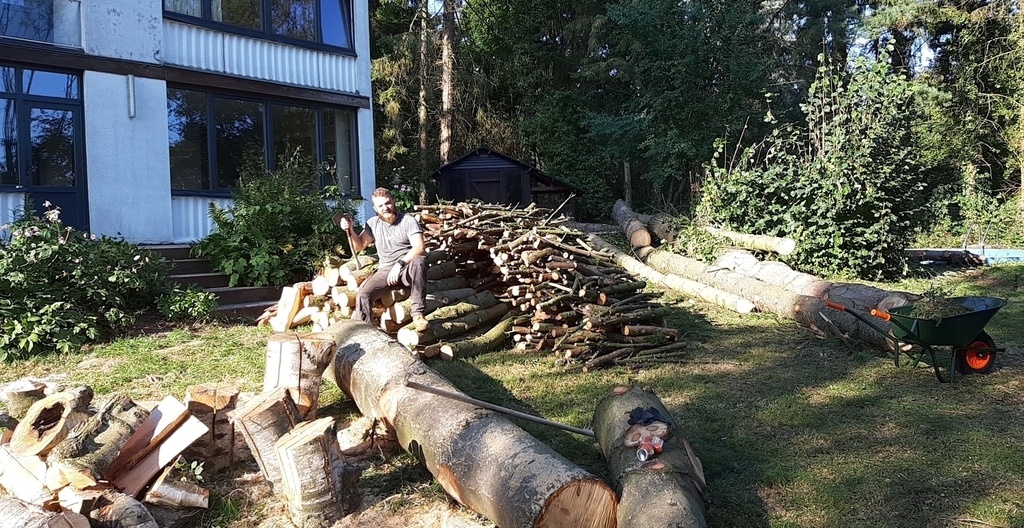 Suite à une tempête, plusieurs sapins sont tombés dans le jardin. Quelques autres gênants pour la maison ont été abattus. C'était l'occasion d'acheter une gruminette afin de valoriser ces bois. Le modèle acheté est un Panthère Mill avec un guide de 105 cm. L'accessoire est monté sur une Stihl MS880. Le rail de guidage pour la première coupe fait 6 mètres, ce qui correspond à la longueur de mes entraits !