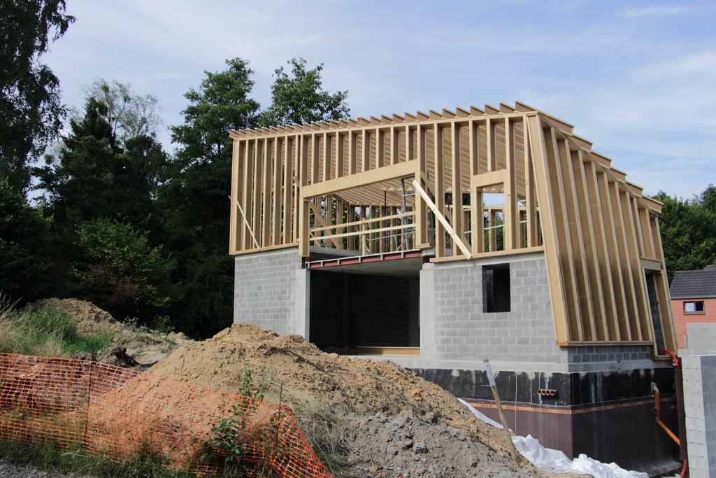 Projet original structure ossature bois avec poutre en I steico joint pan de mur déversé et toiture 1 versant qui suit la pente des deux façade d'inclinaison différente, un projet plutôt sympa à réalisé