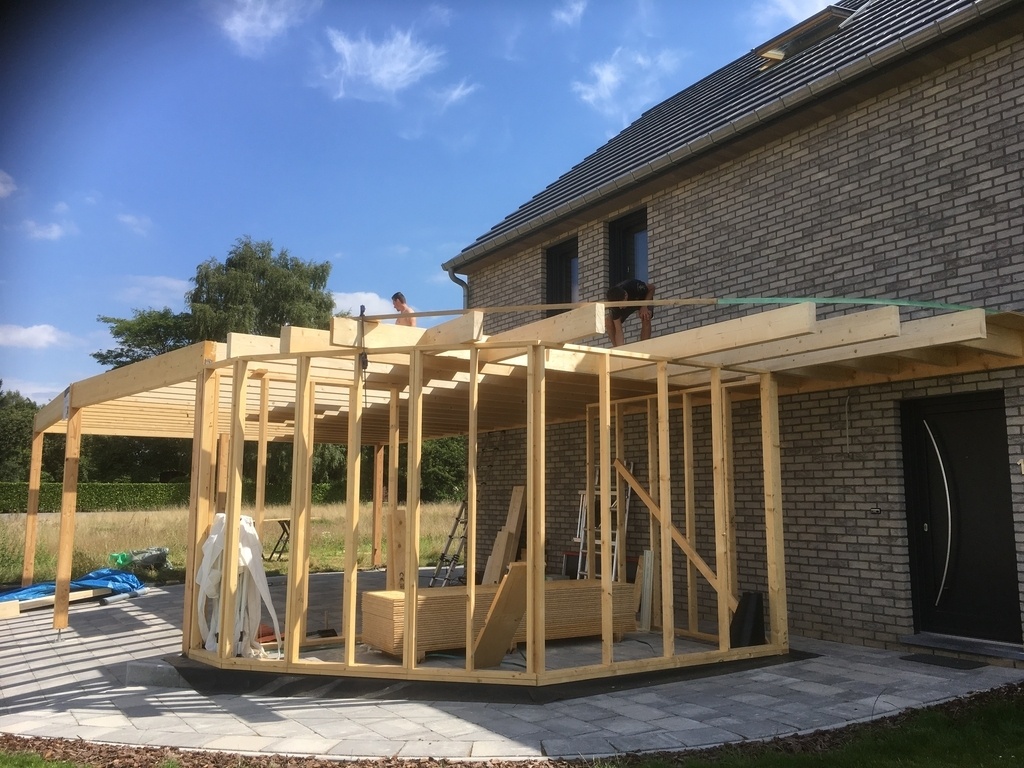 il y a des panneaux osb 22mm sur les solives et du feuillard en croix entre la zone fermée et les partie poteaux, ce carport à 12 ans