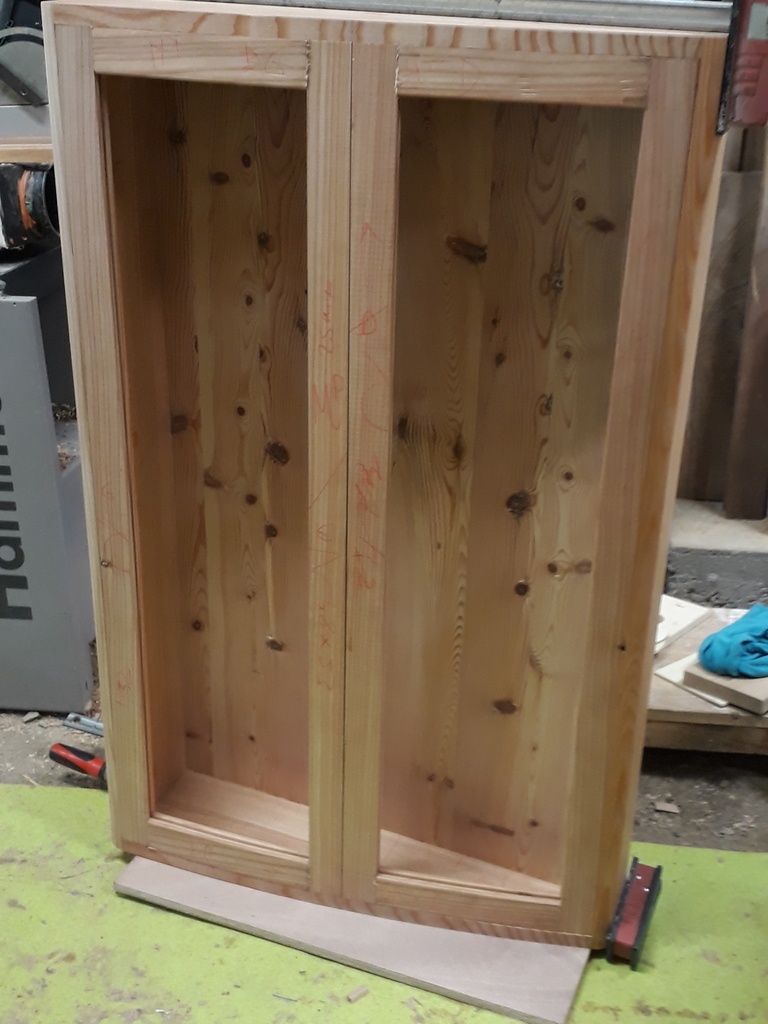 En remplacement d un châssis vitré, fabrication d une tablette et meuble sans réel but utilitaire si ce n est esthétique. Lamellé collé pour les traverses de portes.