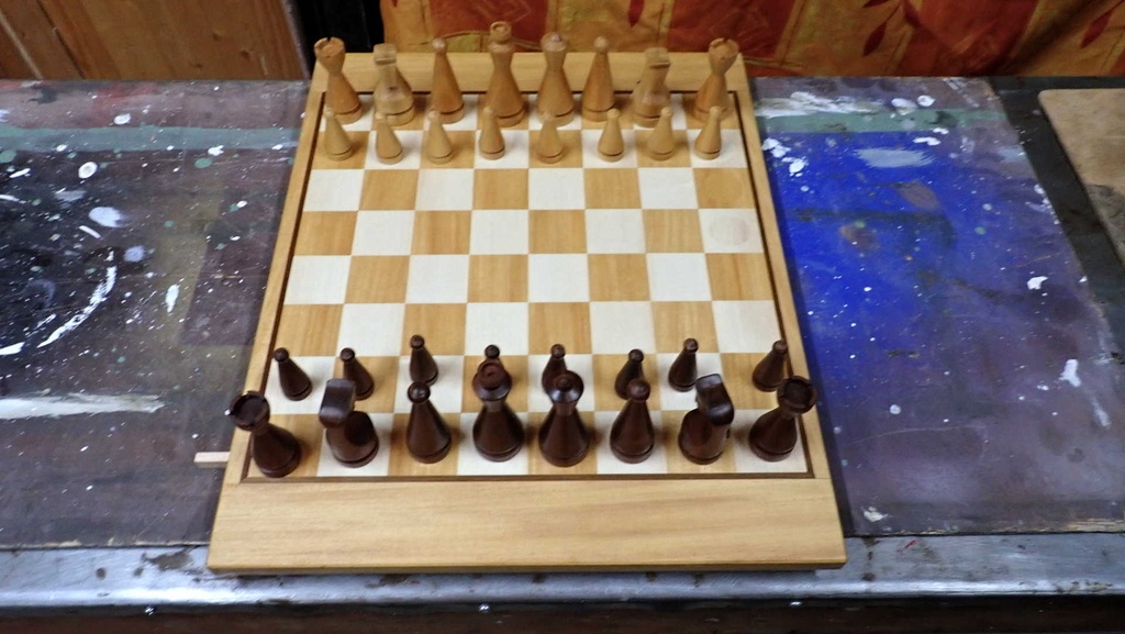 Ma petite-fille a souhaité un jeu d'échecs, en bois, magnétique. Je ne sais pas comment sont faits ceux du commerce (placage sur feuille d'acier ?)