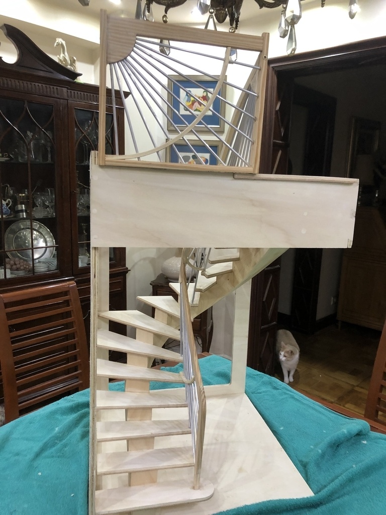 Bravo pour cette maquette. Comme ancien prof de maths (et donc de géométrie) dans une école artistique, je ne peux qu'admirer votre maîtrise du dessin technique pour arriver aux vraies grandeurs du limon et de la rampe. Il ne reste (!!!) alors plus qu'à débillarder...