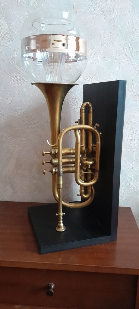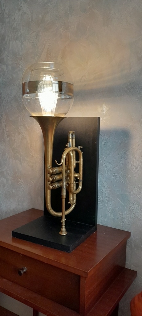 Merci beaucoup. C'est l'idée que j'avais au départ, jouer sur la couleur et le contraste des matériaux. Et je ne regrette pas le résultat. Le plus dur à été de faire passer le fil électrique à l'intérieur de la trompette.