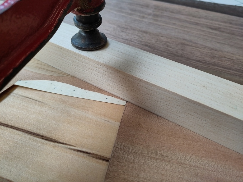 A chaque étape, je bride le nouveau morceau de placage côté parement, je coupe les deux placages en même temps en déplaçant la cale sur chaque trait et en la serrant au serre-joint, j'enlève la chute, et je bride définitivement les deux morceaux ensemble.