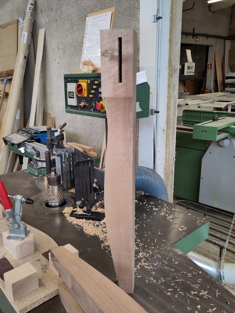 Réalisation des mortaises sur les 4 pieds à la mortaiseuse à bédane oscillant (pour les assemblages des traverses côtés et arrière, la face étant particulière)