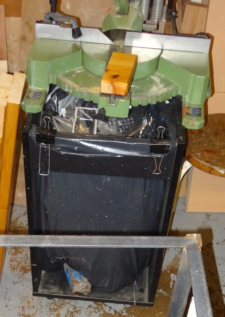Pour autant le principe d’un support de scie hébergeant une poubelle m’intéressait pour ne pas encombrer la petite surface de mon atelier. Le nouveau support de la scie conserve ce principe, en offrant un support de sac poubelle facilement accessible et sur roulettes pour placer la scie là où elle est nécessaire dans l’atelier.