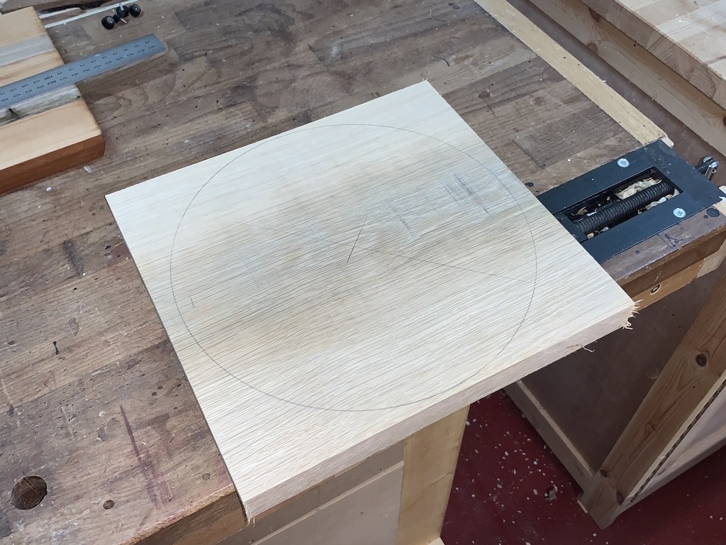 J'ai changé de méthode pour une plus rapide et ai fait mes "galettes" directement à la circulaire sur un gabarit fixé dans les gorges de ma combinée.
