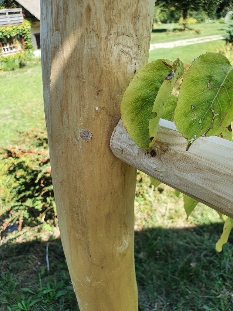 Du coup, tout est fait en frêne tombé lors des derniers épisodes d'orage ou coupé sur pied car les arbres étaient très malades. Pas de bois raboté/dégauchi, juste un peu d'huile de coude pour mettre tout ça en oeuvre.