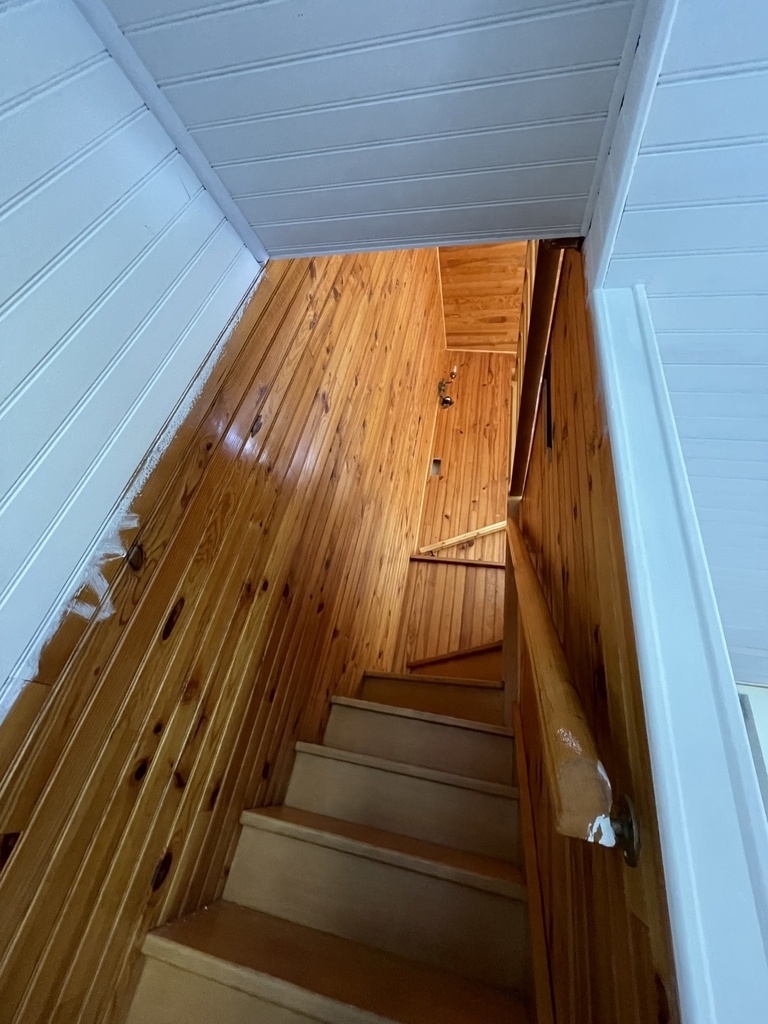- 1ère phase du projet, dépose du lambris, ouverture du plafond et création d'une trémie, prise de cote