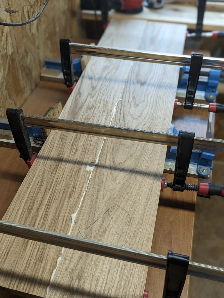 J'ai découpé le bois presque aux bonnes dimensions et j'ai collé les étagères. J'ai dû utiliser la raboteuse pour les rendre parfaitement planes et utiliser beaucoup, beaucoup, beaucoup de serre-joints pour les coller ensemble afin de gagner du temps.