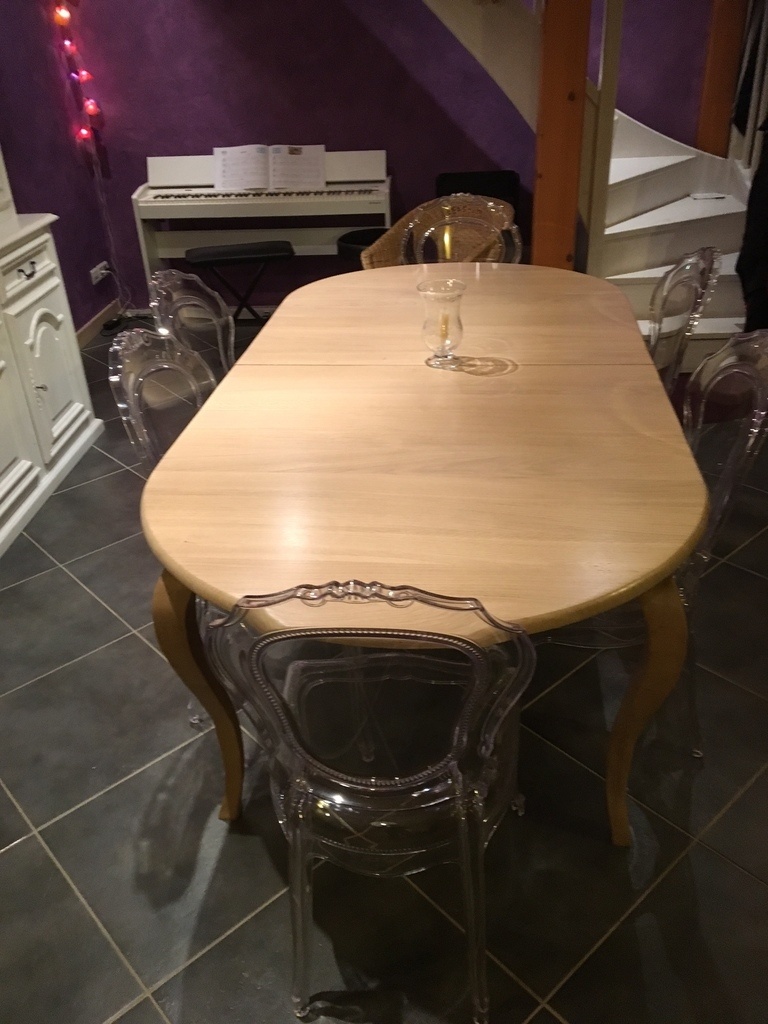 j'annule mon commentaire,je n'avais pas bien vu le système,as tu mis en place les rallonges papillons?envoie une photo de la table avec rallonges,celle ci n'est guère ovale mais plutôt rectangulaire +2demi cercle non?