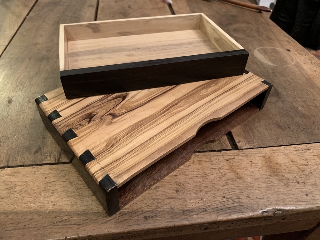 une nouvelle boite (14x22cm) avec un dessus en olivier et le reste en chêne pour partie passé à l'oxyde de fer. le fond du tiroir est en CP de bouleau.le tout fini à la gomme-laque.