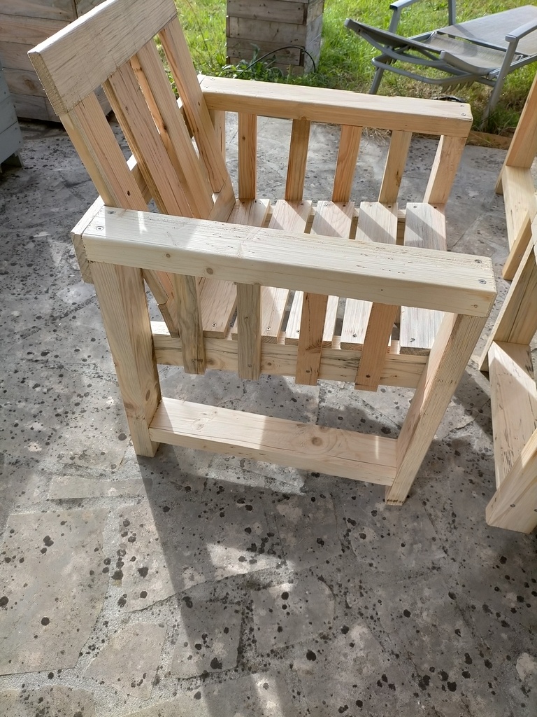 Inspiré d'un plan américain mais adapté aux dimension de mes palettes et modifié au niveau des accoudoirs, des supports et du dossier.