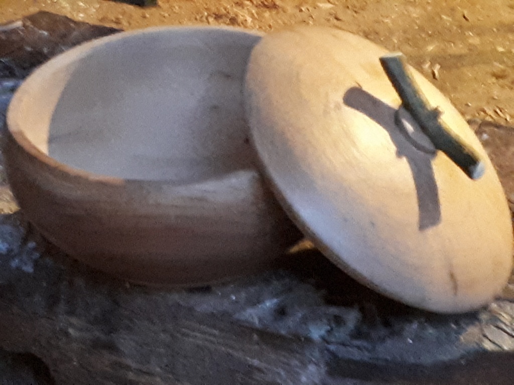 Une boite tournée en noyer pas sec. Le bouton est une branche de sophora.J'ai pu rattraper un forte déformation en chauffant au micro-ondes, puis en forçant le couvercle pendant le refroidissement !