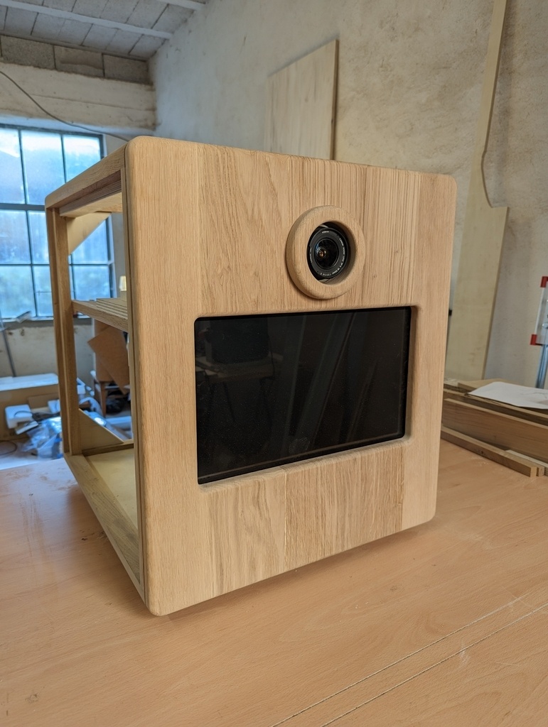Ce photobooth devait être une pièce unique en bois uniquement, devait être démontable en 5mn et transportable dans un coffre de voiture. Il accueil un écran tactile, un appareil photo, un mini pc, une imprimante et peut supporter un flash. Il est autonome et ne nécessite plus d’intervention de la part du photographe pour son exploitation sur la journée. Une trappe arrière fermée à clef laisse accéder aux organes électroniques et permet de retirer les panneaux latéraux pour la maintenance.