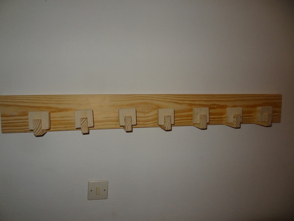 Voici un petit porte manteaux, que j'ai réalisé avec mes chutes de bois. Les supports sont à mi-bois, le tout fixés avec tourillons et colle sur la planche. Pas grand chose à dire dessus, mise à part que cela ma permis d’expérimenté une fabrication d'une mini série.