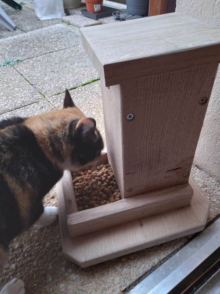 Avec chutes de chêne, fabrication d'un distributeur de croquettes pour chat.