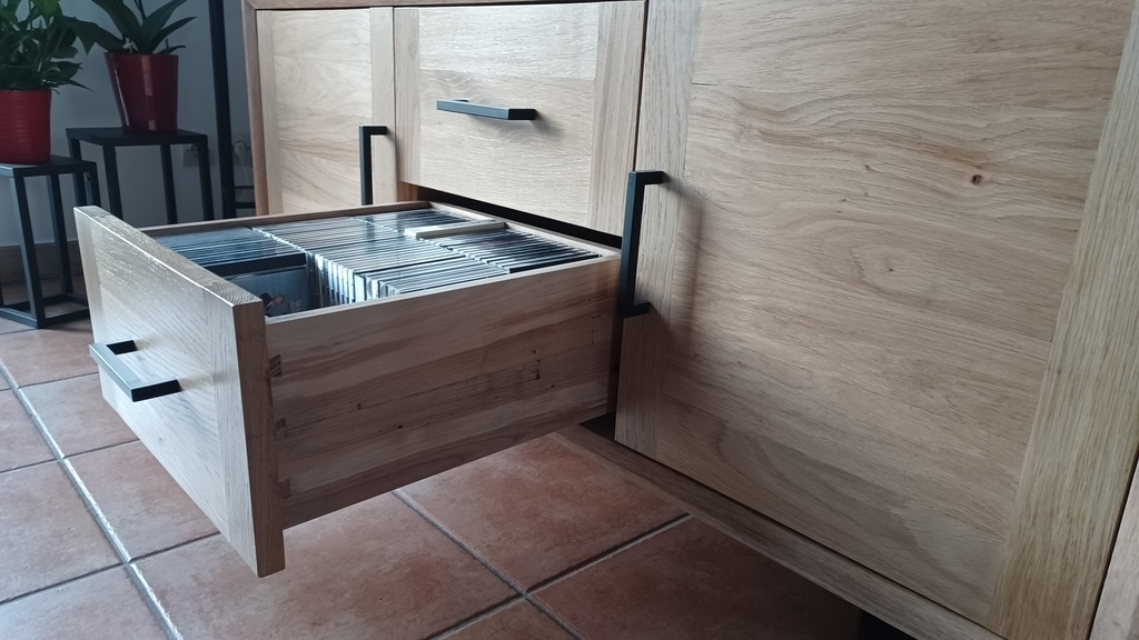 Le corps de ce meuble TV, ainsi que la façade sont en chêne. Les caissons des tiroirs sont en frêne.