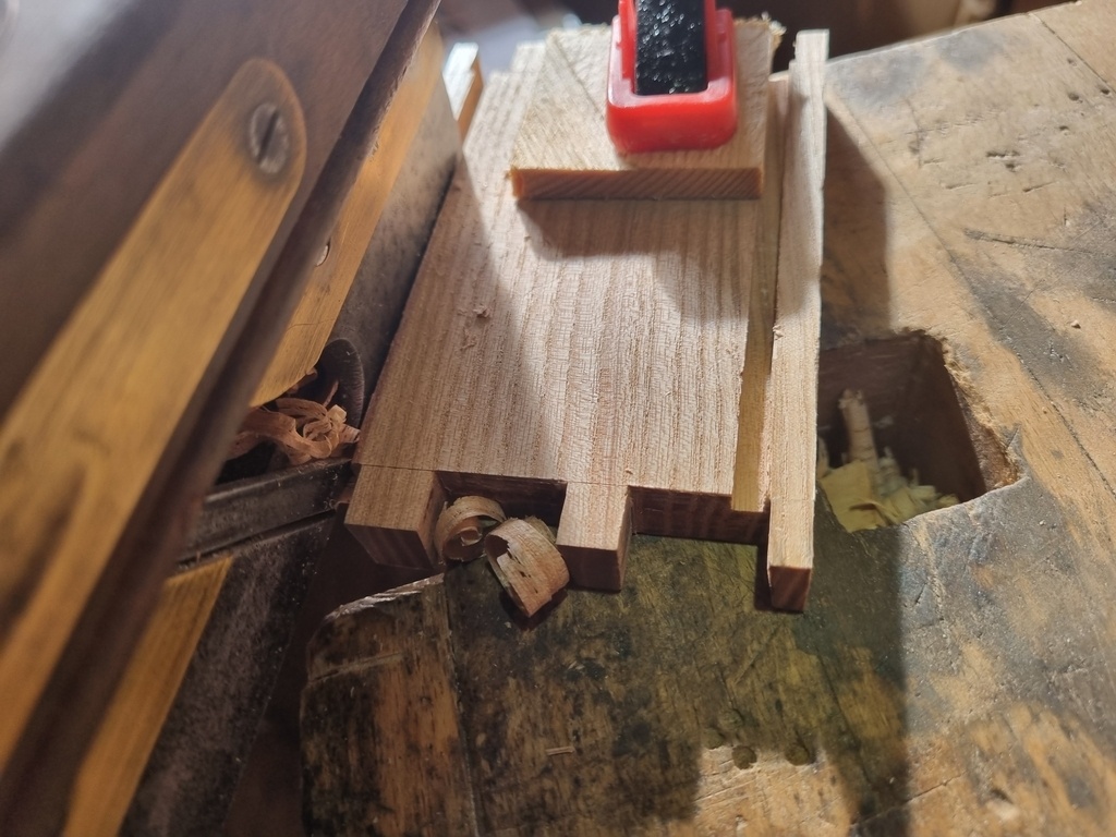 Ces deux pièces présentent une feuillure qui fait tout le tour. La réalisation est la suivante : 4 traits de scie à la bonne profondeur, retrait du maximum de matière au ciseau, établissement de la profondeur finale à la guimbarde.