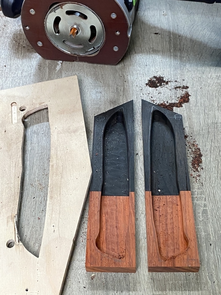 Découpage approximatif de la forme finale. Seule la face avant du manche (coté garde de la lame) est découpée à la côte puis poncée jusqu’au grain 320.