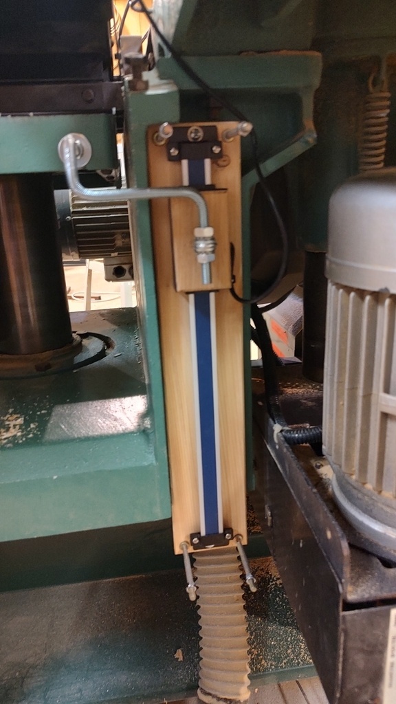 J'ai positionné le capteur au plus haut sur la règle pour paramétrer le zéro en laissant la tige filetée libre entre les 2 écrous, dans le piton. Ensuite j'ai fait un rabotage à la cote 19 mm sur l'index d'origine de la machine validée au pied à coulisse sur la pièce rabotée. J'ai ensuite déplacé le capteur de la règle numérique pour atteindre la cote donnée par le pied à coulisse et j'ai bloqué la position en emprisonnant le piton entre les 2 écrous avec rondelles stop.