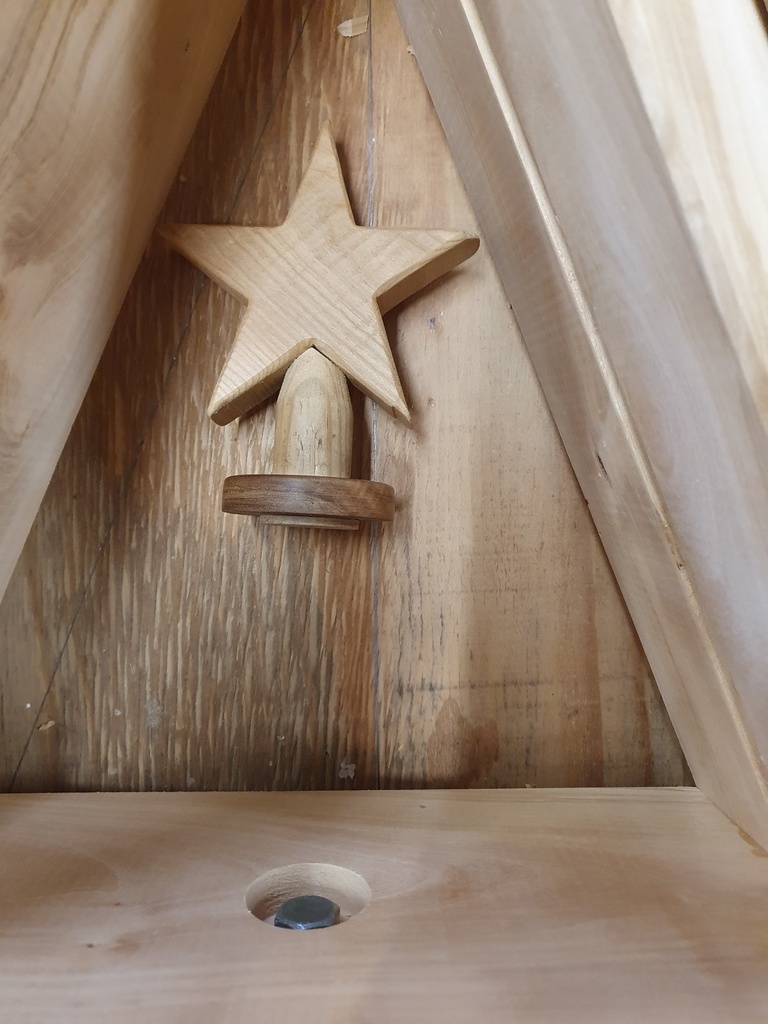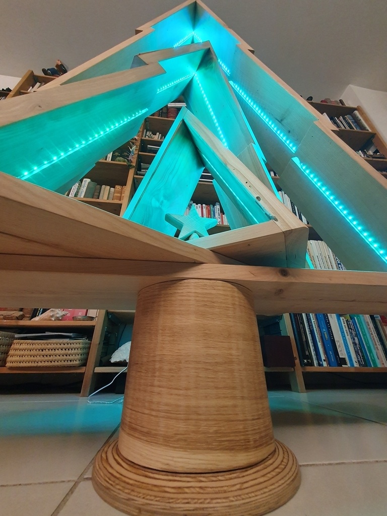 Une tige filetée traverse l'ensemble afin de bloquer et stabiliser le tout. Les leds empêche de pouvoir tourner le sapin librement donc la tige fileté bloque le tout et empêche la rotation. Cependant il est possible de replier les sapin afin qu'il prenne moins de place le reste de l'année