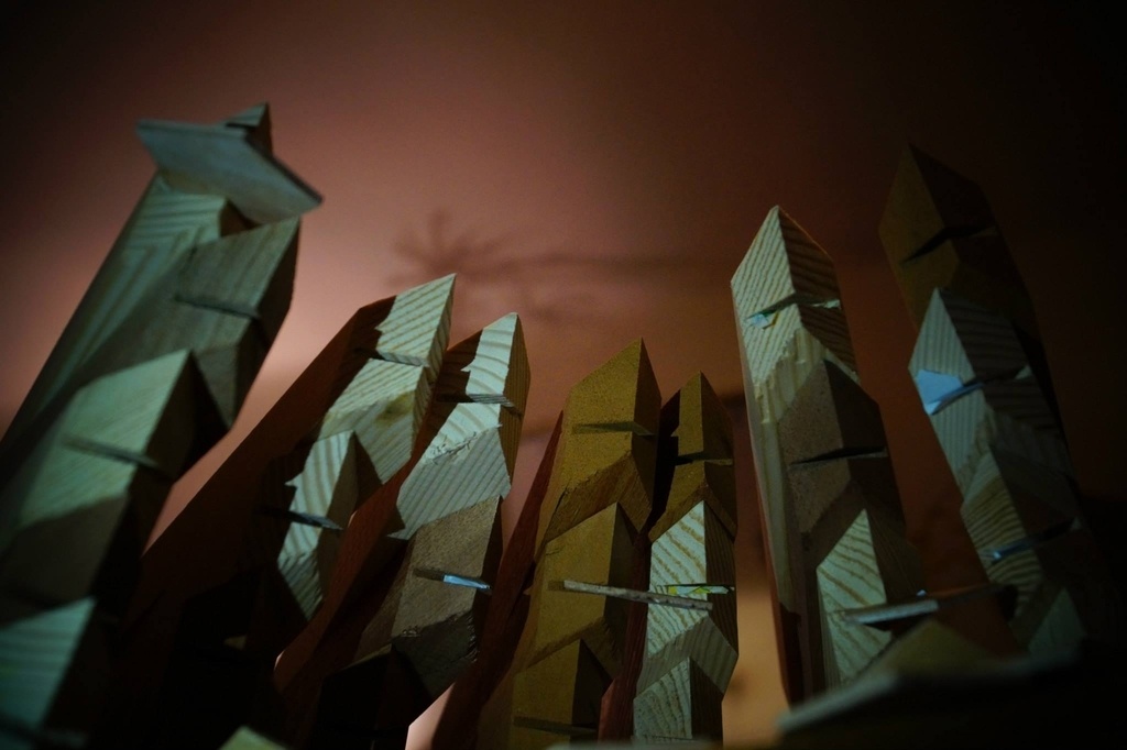 Je n'ai malheureusement pas de photo de cette étape. J'ai enduit à la colle blanche lente les languettes et leur rainure sur chaque brin, ainsi que les faces en contact. Puis une fois la pièce entière assemblée elle tient grâce à la friction dans les rainures mais il faut serrer et donner la forme la plus ronde possible. Donc j'ai enroulé du film plastique de cuisine autour en tirant fort dessus pour comprimer les assemblages, dans toutes les directions, fait quelques ajustages à la main.