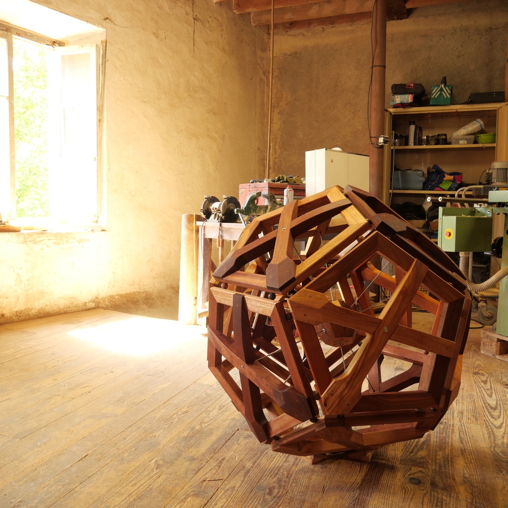 Dodécaèdre assemblé par tenségrité à partir de 12 faces en bois de diverses essences, 60 billes en pierre (fabriquées par mes soins), 6 câbles inox et un petit dodécaèdre.