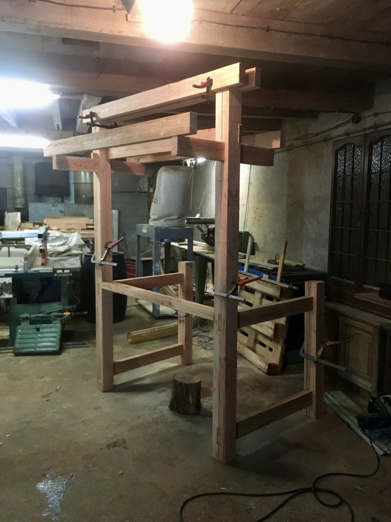 Les perches étant assez limité en diamètre (environ 15cm), il a fallu réduire la section et doubler certaine pièces en épaisseur. Cela permet de simplifier un peu la réalisation des assemblages