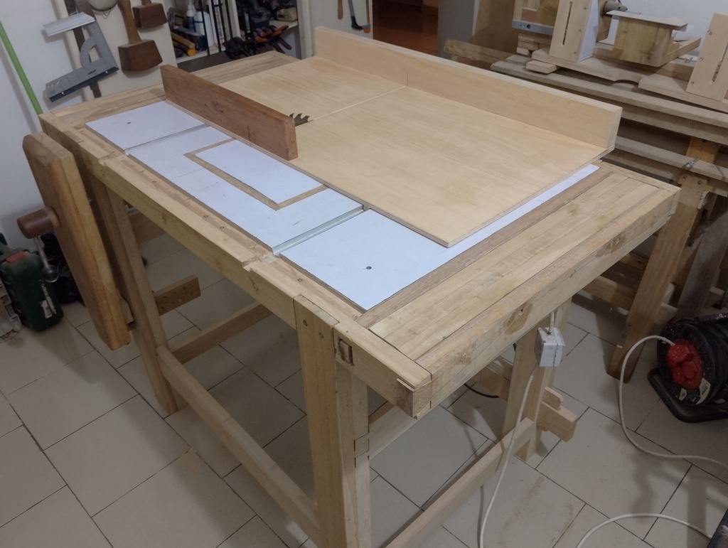 J'ai réussi à me fabriquer un établi, qui doit servir à peu près à tout - travail avec outils à main, table de sciage, défonceuse, montage... Enfin bref,tout ce que ça peut, et pas très grand, vu que ma petite chambre d'amis est temporairement devenue atelier.