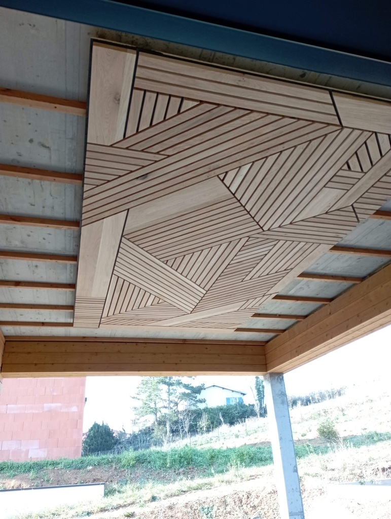 Réalisation d’un plafond d’une terrasse avec des panneaux chêne épaisseur 20 mm.