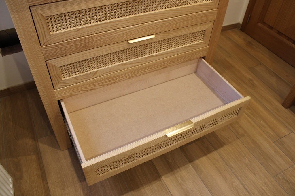 Réalisation d'une commode en frêne blanc qui fait également office de table à langer. Assemblage tenon mortaise. Panneaux de 15mm en massif encastrés dans des rainures. Tiroirs sur coulisse EMUCA. Façade de tiroir avec du cannage en rotin. 30-35h de travail environ.