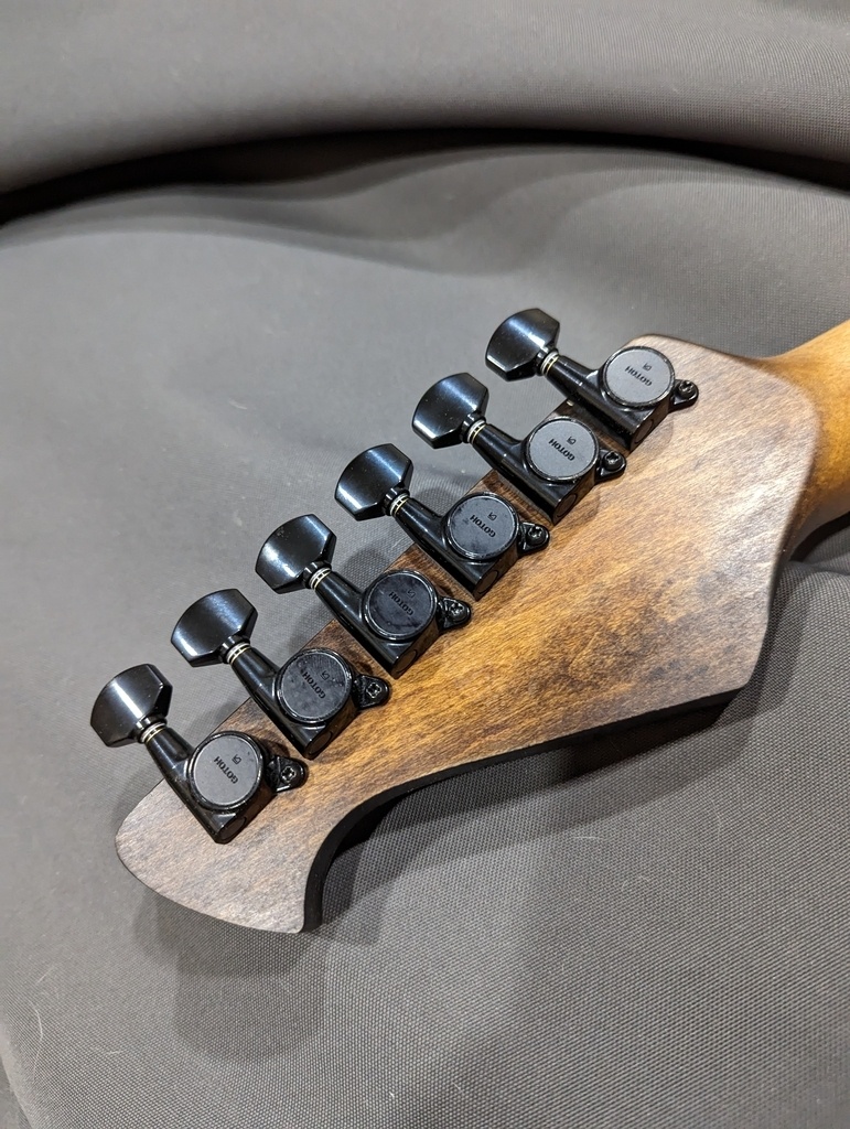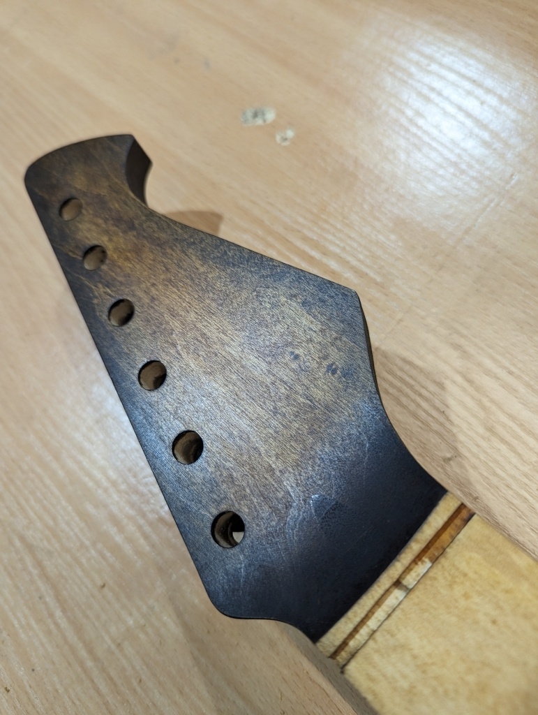 Je n'ai pas les photos des défonces intermédiaires, mais tant pis. Ponçage 180 puis 300, on mouille, on recommence et ainsi de suite, avant de passer à la teinte à l'eau. Je fais un sunburst naturel/brun/noir, je trouve que ça renforce la personnalité de la guitare. Et au passage, je rencontre mon deuxième problème : je renverse de la teinte brune, pure, sur la tête... y'a plus qu'à teinter la tête, je m'en sors pas mal, car j'ai pu obtenir un rendu qui rappelle le corps et faire un fondu de la teinte avec le manche. Au passage je jaunis un peu l'érable, trop neuf. Et je passe une première couche d'huile de chez Crimson Guitars.