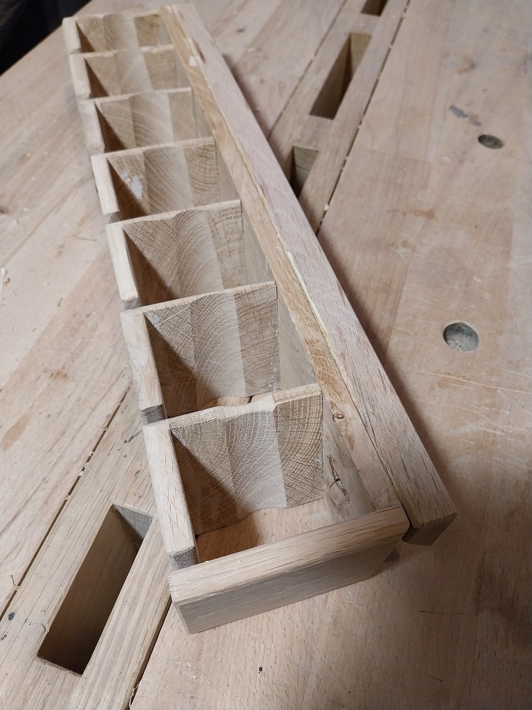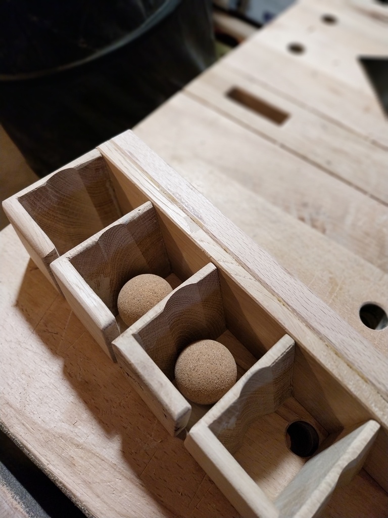 Une deuxième version de rangement pour scie, la première n’était en fin de compte pas du tout pratique à utiliser. Quelques chutes de chêne, des balles de babyfoot.