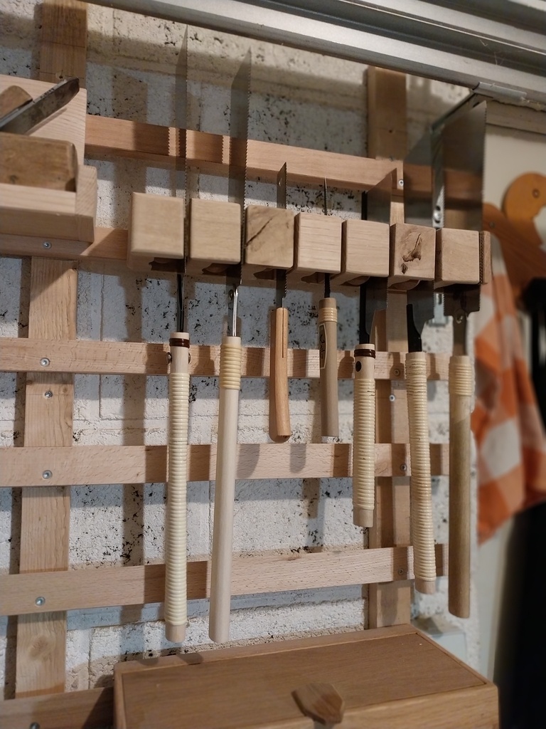 Belle réalisation, avec le luxe d'une rainure pour la bille. Ça fonctionne très bien également pour les équerres et lattes, mais pas bien pour les scies étroites. Par contre, ça prend plus de place qu'avec des outils placés dans l'autre sens dans des encoches. Mais on a tous trop de place pour ranger les outils dans nos ateliers