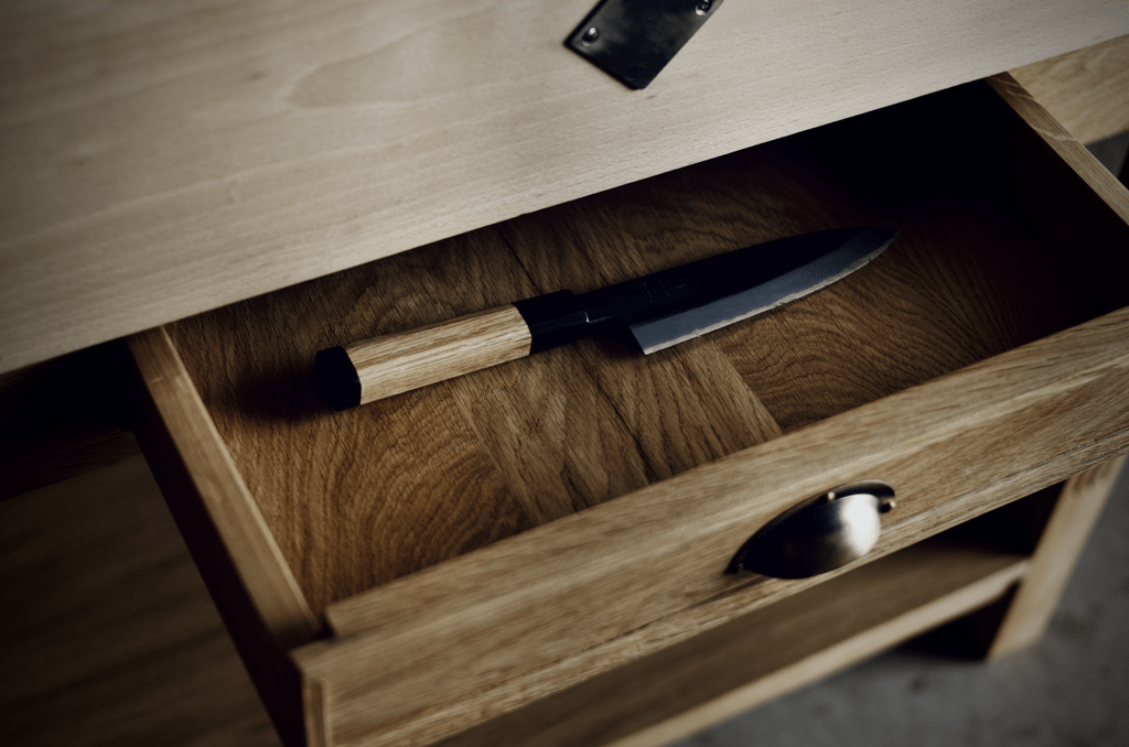 Une finition à l'huile de pépin de raison a été apposée sur le bois de bout pour un usage alimentaire et le reste du meuble a été vernis au pistolet.