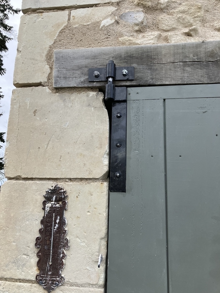 Voici deux portes de grange que j’ai fabriquées en Douglas avec tenons et mortaises. J’ai opté pour des ferrures Traditionnelles fabriquées sur le modèle de celles que l’on voit dans les fermes de la région tourangelle.