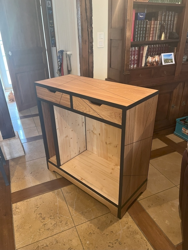 Avec panneaux en pin pour les intérieurs et en chêne avec incrustation de bande en valchromat pour les cotés et le dessus.