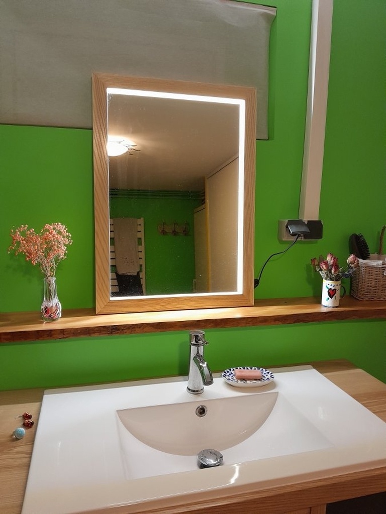 Petit miroir éclairant, fait avec les chutes du meuble sous vasque, et en un temps record (6 mois !).