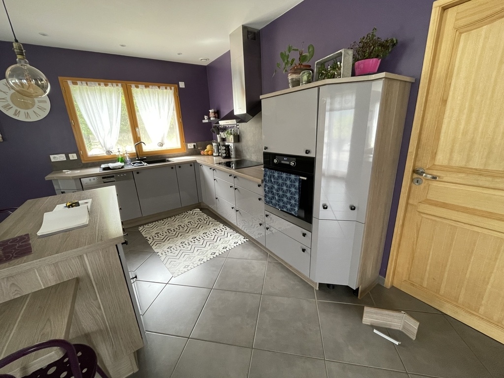Remplacement des anciennes façades en mdf stratifié gris, des joues en mdf stratifié chêne grisé, des plans de travail, des crédences et des plinthes.