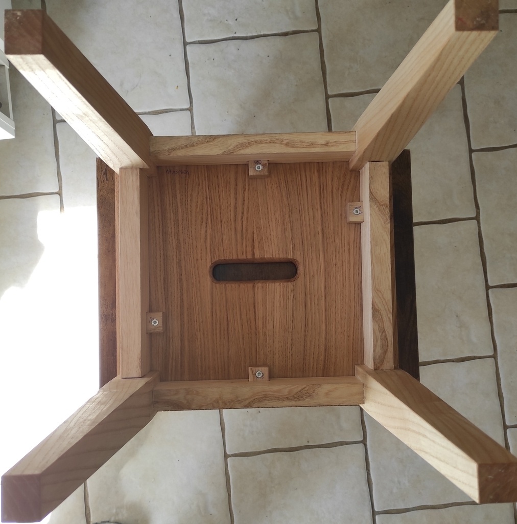 Le tabouret est un cube de 30-33cm de côté avec des pieds gainés.