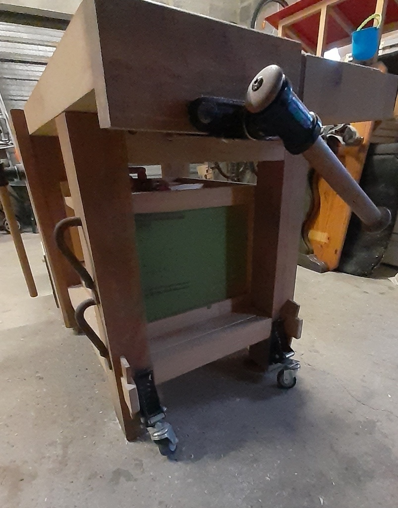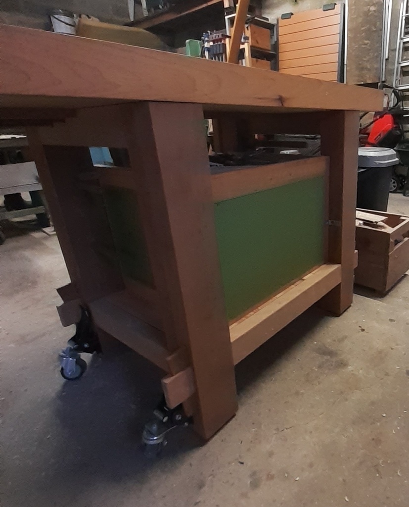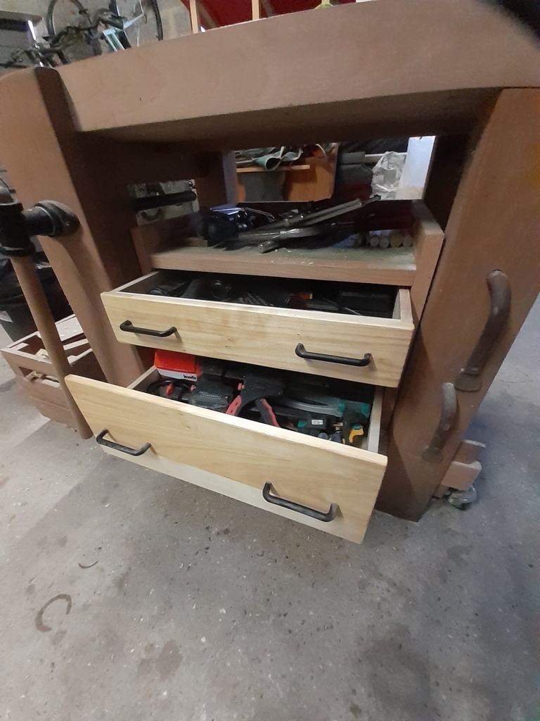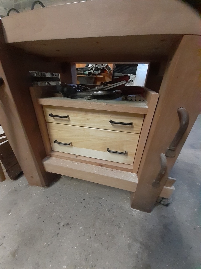 Ajout récent d'un caisson en hêtre et mdf peint. Avec deux tiroirs en sapin et coulisses en bois.