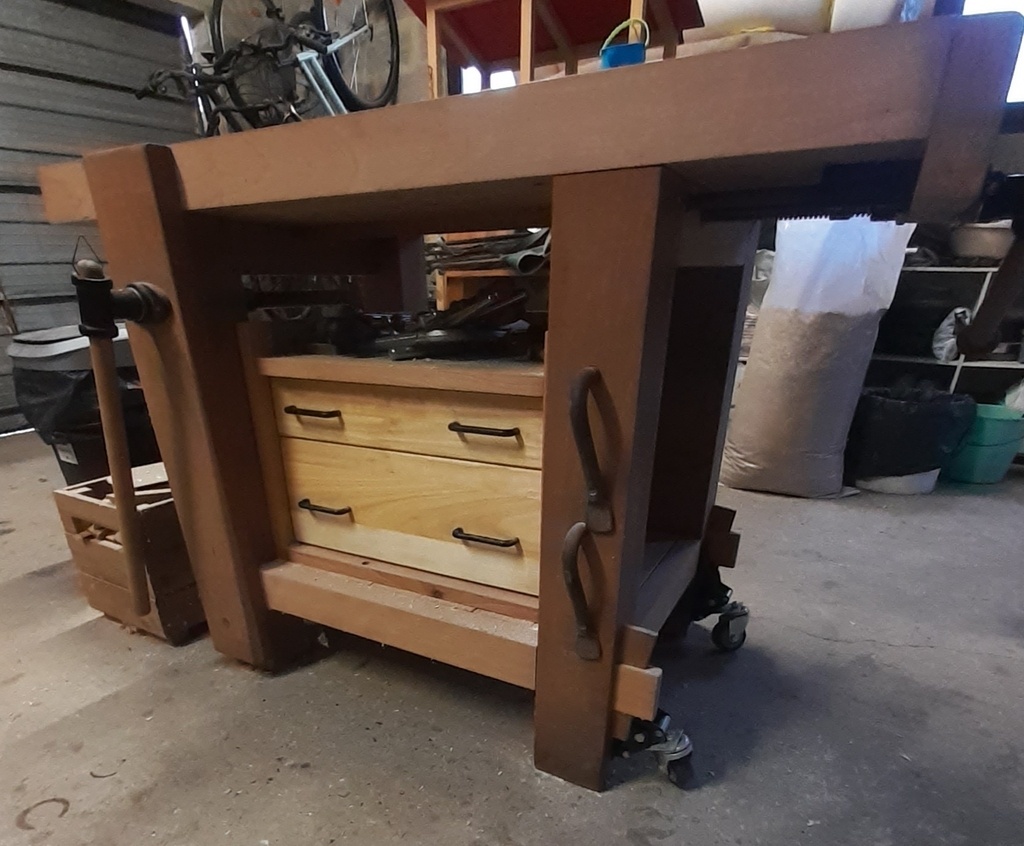 Etabli en hêtre, porte-outils central et tablette inférieure en sapin.