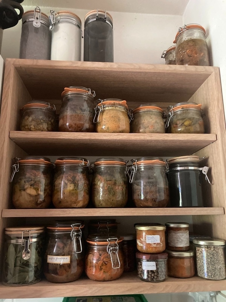 L'objectif était de faire une petite étagère de cuisine (630 x 640 x 250) destinée à recevoir beaucoup de conserves en verre (50 kg selon mon estimation). Pour la solidité, Je suis donc parti sur un assemblage à queues d'arondes avec le champ visible en onglet pour l'esthétique.