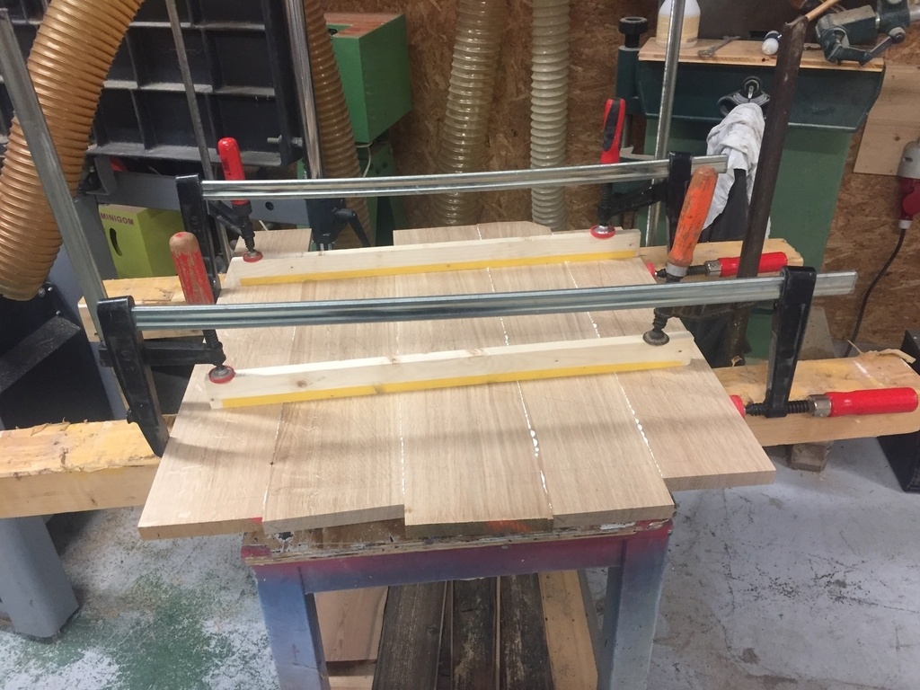 Ensuite vient l'assemblage, fait en partie avec les grosses machines de l'atelier car il est plus simple de faire une coupe à l'onglet avec une belle machine d'atelier. Les finitions chez moi pour ce qui est du ponçage, défonceuse et premier passage de l'huile.