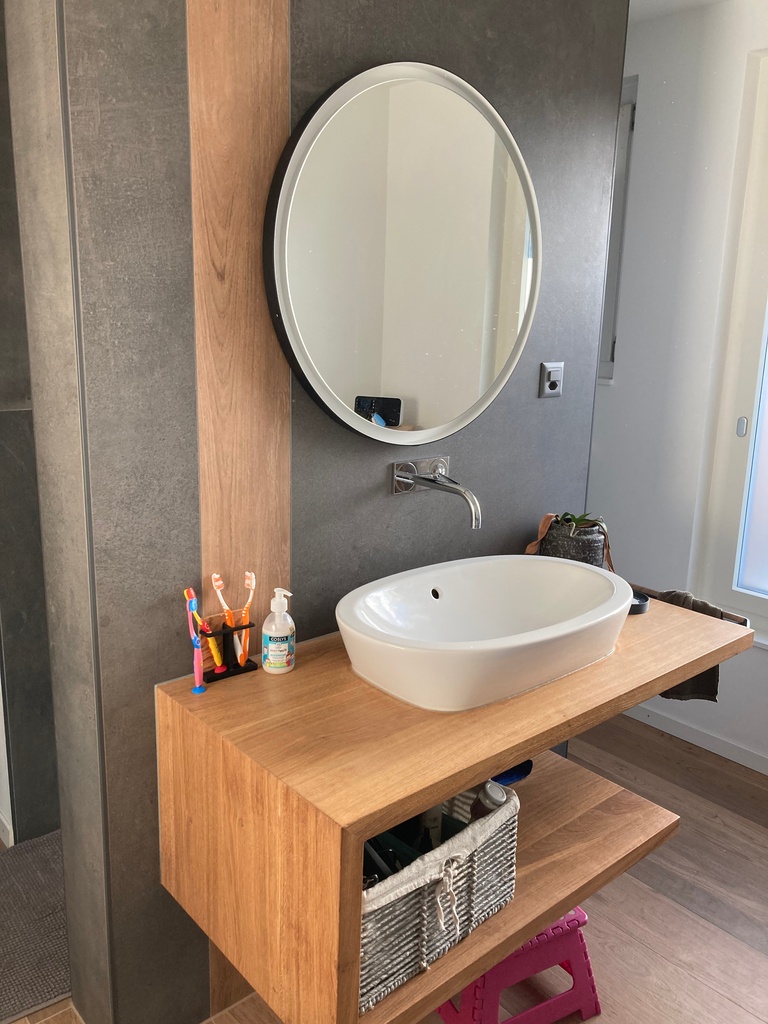 Voilà un projet qui m'a tenu à coeur et occupé un moment à côté de mon travail car je souhaitais toucher à quelques bases de la menuiserie en partant de planches de chêne brutes pour faire les meubles de ma salle de bain de mes propres mains. LE plus long a été de trouver un atelier pour m'accueillir près de chez moi. Au fil des discussions j'ai trouvé une connaissance qui m'a aidé avec son atelier et ses conseils de menuisier.