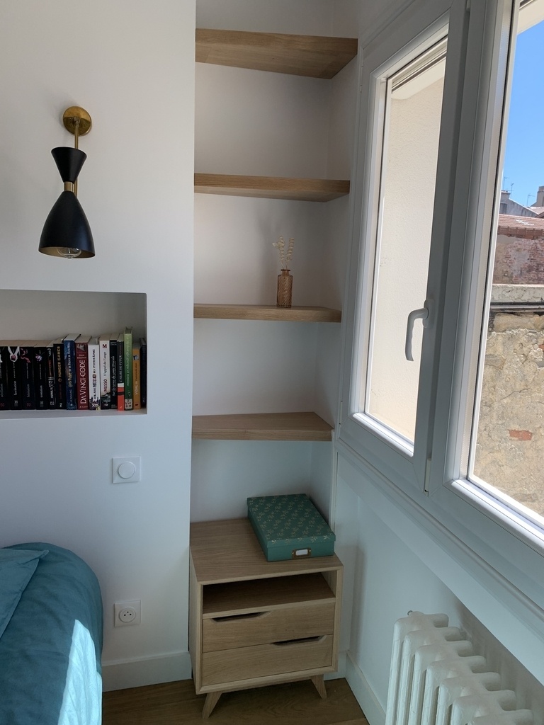 J'attaque par le côté gauche. Tout se passe bien, ça rentre pile poil. Viens ensuite le côté droit et là badableiii. En gros pinpin que je suis j'avais pas pensé à la fenêtre qui m'empêchait de glisser mes étagères sur les tasseaux.