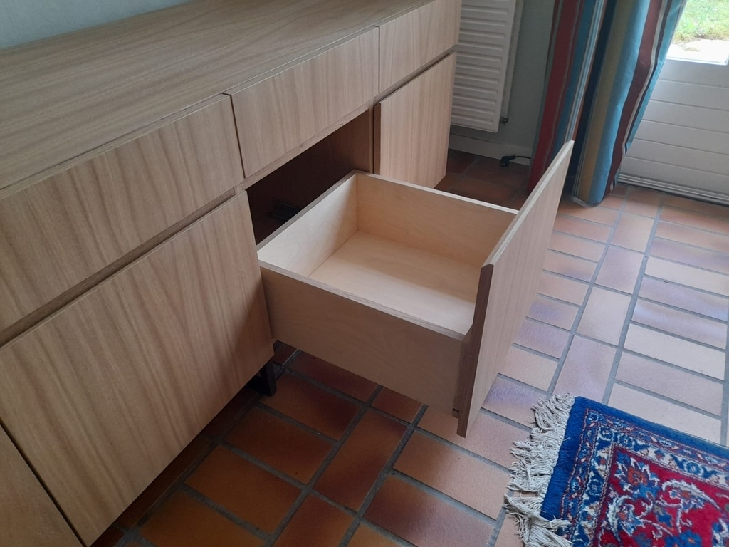 Mais la vraie raison est surtout esthétique : je voulais créer un espace plus grand entre les tiroirs et les portes pour rompre un peu la façade en soulignant la longueur du meuble. Et donc le grand chanfrein permet de passer facilement les doigts.
