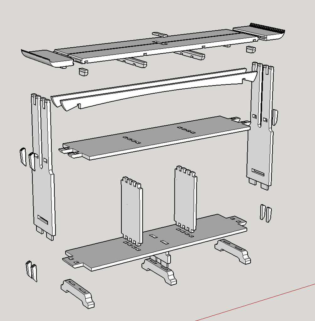 Le plateau du dessus est tant qu'a lui glissé sur queue d'aronde, ces dernière se trouvant au sommet des montants latéraux et sur les supports centraux (en noir)